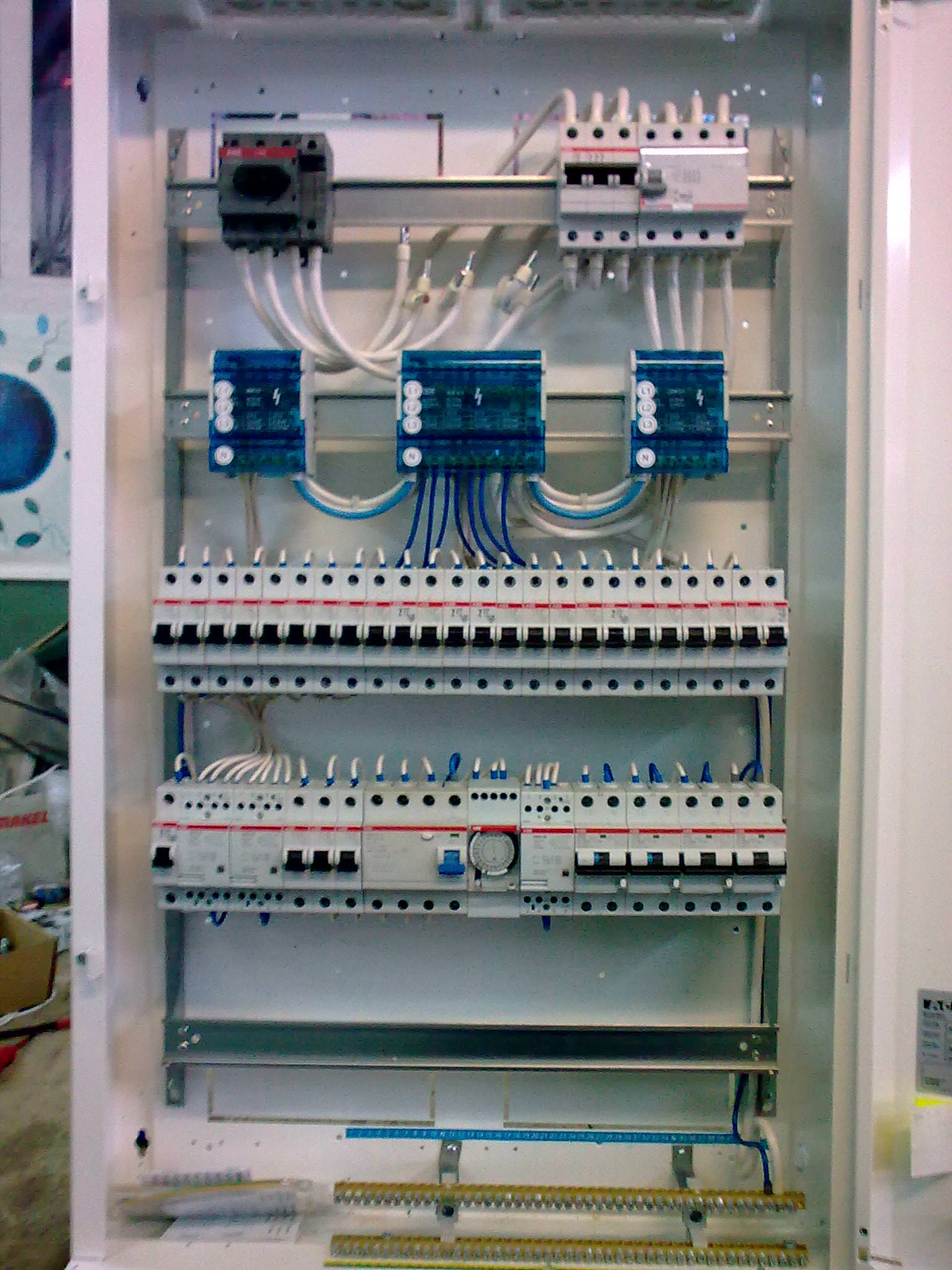 Каждый электрический шкаф может обеспечить необходимым напряжением питания (380 или 220 вольт) в зависимости от конкретных запросов потребителя. Так, например, бытовая нагрузка (электрочайники, настольные лампы, мелкие бытовые приборы и пр.) питается от однофазной сети 220 Вольт, электродвигатели вентиляционных установок питаются от трехфазной сети 380 Вольт. Как же совместить однофазную и трехфазную нагрузку? Вопрос о правильном распределении однофазной электрической нагрузки 220 Вольт между тремя фазами 380 Вольт и нулевой точной, в целях исключения "перекоса фаз", решается на этапе проектирования и сборки электрических распределительных шкафов.